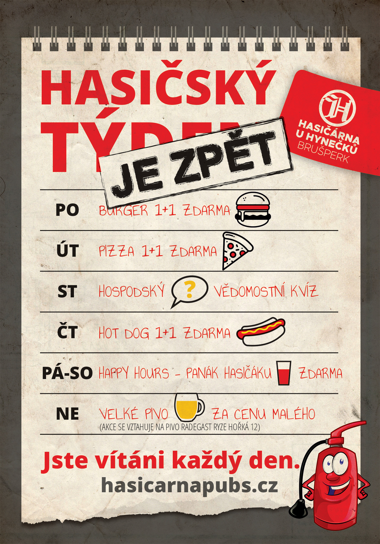 A proč se náš koncept jmenuje Hasičárna? Protože  hasíme Vaši žízeň každý den! Industriální a chlapský duch  hasičských zbrojnic umocní návštěvu vynikajícím jídlem, skvěle ošetřeným pivem spolu s ochotným a přátelským personálem. U nás jste vždy vítáni!